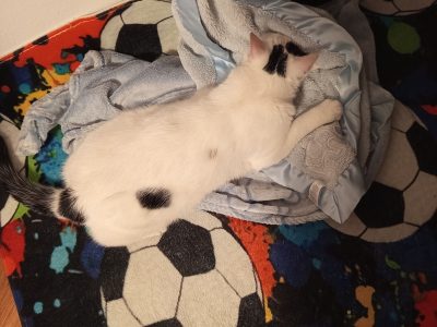 Napomena: Došla je k nama početkom 9 mj tj muž ju je našao i udomili smo ju. Procjena je tada bila veterinara 2-2.5 mj. Cijepljena je jednom u Lučkom. Bijela sa…