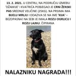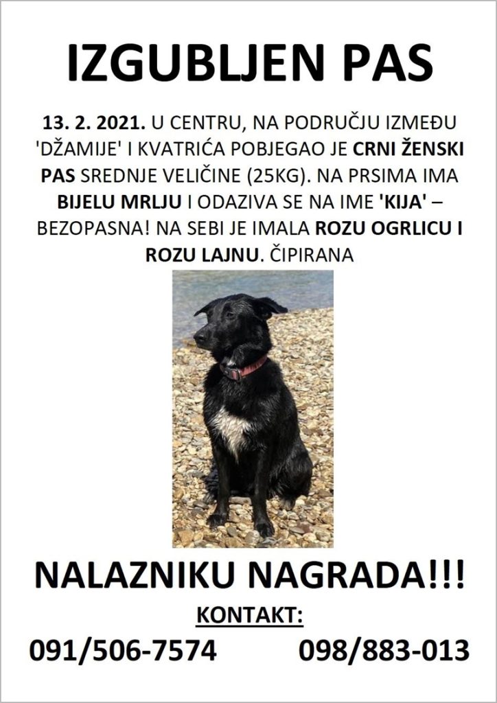 13.02.2021. oko 19 sati uCentru, Bauerova ulica, Trg Žrtava Fašizma, pobjegla je crna kujica srednje veličine (25kg). Odaziva se na ime Kija, jako je umiljata. Na sebi ima rozu ogrlicu i rozu lajnu. Teska je oko 25 kg, i ima bijelu mrlju na psima.NAGRADA NALAZNIKU